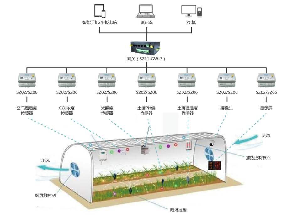 以生態(tài)溫室為例,隨著遠(yuǎn)程監(jiān)控系統(tǒng)、無線傳感器監(jiān)測等技術(shù)日趨成熟,物聯(lián)網(wǎng)、大數(shù)據(jù)等技術(shù)已逐步應(yīng)用到了生態(tài)農(nóng)業(yè)建設(shè)中。通過環(huán)境、動(dòng)植物信息檢測,溫室農(nóng)業(yè)大棚信息檢測和標(biāo)準(zhǔn)化生產(chǎn)監(jiān)控,精準(zhǔn)農(nóng)業(yè)中的節(jié)水灌溉等應(yīng)用模式,提高了農(nóng)業(yè)生產(chǎn)的管理效率、提升了農(nóng)產(chǎn)品的附加值、加快了智慧農(nóng)業(yè)的建設(shè)步伐。其主要方式通過安裝于指定的監(jiān)測點(diǎn)的空氣溫濕度傳感器、土壤溫濕度傳感器、土壤PH傳感器、光合有效輻射傳感器、CO2傳感器等設(shè)備實(shí)時(shí)監(jiān)測空氣的溫濕度、二氧化碳濃度、土壤溫濕度及PH值等相關(guān)數(shù)據(jù);聯(lián)動(dòng)控制系統(tǒng)由加熱、噴灌、通風(fēng)、卷簾設(shè)備及其配套PLC及Wifi設(shè)備服務(wù)器組成,當(dāng)傳感器采集的環(huán)境數(shù)據(jù)與標(biāo)準(zhǔn)值對比超出臨界范圍時(shí),控制器自動(dòng)啟動(dòng)相關(guān)硬件設(shè)備對作物生長環(huán)境加熱、澆水、通風(fēng)、卷簾加減光照輻射,實(shí)現(xiàn)作物生長過程精確控制。同時(shí)在塑膜日光溫室旁,建立地下沼氣池,沼氣池上方建圈舍及廁所,形成一個(gè)封閉的智慧化能源生態(tài)系統(tǒng)。在此系統(tǒng)內(nèi),圈舍溫度在冬天提高3~5℃,為禽畜提供了更適宜的生長條件,使豬的生長期大幅縮短約150天。禽畜糞便為沼氣池提供原料,產(chǎn)出的沼氣用于家庭供暖,殘留的沼渣、沼液作為溫室作物的肥料。此外,豬等禽畜呼吸排出的CO2可促進(jìn)溫室內(nèi)作物光合作用,蔬菜產(chǎn)量和質(zhì)量明顯提高。