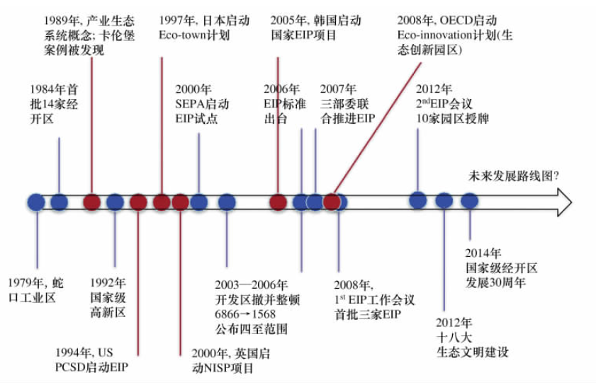 生態(tài)工業(yè)園區(qū)是產(chǎn)業(yè)生態(tài)學(xué)研究和實(shí)踐的重要載體之一。工業(yè)園區(qū)這一人工經(jīng)濟(jì)系統(tǒng)在發(fā)展中有意識地模仿自然生態(tài)系統(tǒng),應(yīng)用系統(tǒng)工程的理論和方法,對現(xiàn)有園區(qū)進(jìn)行重新規(guī)劃、設(shè)計(jì)和建設(shè),以提高資源、能源利用效率,減少污染物產(chǎn)生和排放,改善環(huán)境質(zhì)量,促進(jìn)經(jīng)濟(jì)持續(xù)發(fā)展。2000年以來,歐美國家、澳大利亞、日本、韓國、新加坡、印度、巴西等國家都出現(xiàn)了一系列關(guān)于生態(tài)工業(yè)園區(qū)案例的實(shí)證分析。工業(yè)發(fā)達(dá)國家生態(tài)工業(yè)園區(qū)發(fā)展的代表性例子包括丹麥、美國、英國、日本和韓國,下圖為幾個(gè)主要國家及中國推進(jìn)生態(tài)工業(yè)園區(qū)發(fā)展的演變概覽。發(fā)達(dá)國家現(xiàn)階段關(guān)于生態(tài)工業(yè)園區(qū)發(fā)展的重點(diǎn)問題主要集中在以下方面:(1)生態(tài)化發(fā)展的驅(qū)動(dòng)力,包括園區(qū)建立物質(zhì)、能量、信息、廢棄物等集成系統(tǒng)過程中潛在干系方之間建立合作聯(lián)系的驅(qū)動(dòng)力;(2)生態(tài)化發(fā)展準(zhǔn)則,目的是定義并識別推動(dòng)生態(tài)化發(fā)展的創(chuàng)新行動(dòng)(3)生態(tài)化發(fā)展成功要素,目的是從政治、經(jīng)濟(jì)、社會(huì)和環(huán)境識別各園區(qū)生態(tài)創(chuàng)新的成功要素;(4)定義針對推動(dòng)園區(qū)生態(tài)創(chuàng)新有效發(fā)展和管理的關(guān)鍵問題。