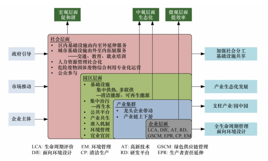 我國實(shí)施可持續(xù)發(fā)展戰(zhàn)略要求發(fā)展生態(tài)工業(yè),打破“綠色壁壘”也需要工業(yè)的生態(tài)化發(fā)展,可以說,生態(tài)工業(yè)是我國工業(yè)發(fā)展的必然選擇。生態(tài)工業(yè)理念被引入中國后,原國家環(huán)??偩钟?000年開始推動(dòng)生態(tài)工業(yè)園區(qū)建設(shè),發(fā)展過程中逐步形成了“有標(biāo)準(zhǔn)可依,依標(biāo)準(zhǔn)建設(shè),據(jù)標(biāo)準(zhǔn)考核,示范試點(diǎn)帶動(dòng),建立長效機(jī)制”的發(fā)展路線圖。鑒于開發(fā)區(qū)面臨的嚴(yán)峻環(huán)境保護(hù)形勢,國家稅收政策調(diào)整、資源和能源緊缺、環(huán)保標(biāo)準(zhǔn)提高等伴隨的發(fā)展壓力,以及節(jié)能減排科技需求,2007年環(huán)保部、商務(wù)部、科技部聯(lián)合,加強(qiáng)對國家生態(tài)工業(yè)示范園區(qū)建設(shè)的推進(jìn)。生態(tài)工業(yè)示范園區(qū)是依據(jù)清潔生產(chǎn)要求、循環(huán)經(jīng)濟(jì)理念和工業(yè)生態(tài)學(xué)原理而設(shè)計(jì)建立的一種新型工業(yè)園區(qū)。它通過物流或能流傳遞等方式把不同工廠或企業(yè)連接起來,形成共享資源和互換副產(chǎn)品的產(chǎn)業(yè)共生組合,使一家工廠的廢棄物或副產(chǎn)品成為另一家工廠的原料或能源,模擬自然系統(tǒng),在產(chǎn)業(yè)系統(tǒng)中建立“生產(chǎn)者—消費(fèi)者—分解者”的循環(huán)途徑,尋求物質(zhì)閉環(huán)循環(huán)、能量多級利用和廢物產(chǎn)生最小化。
