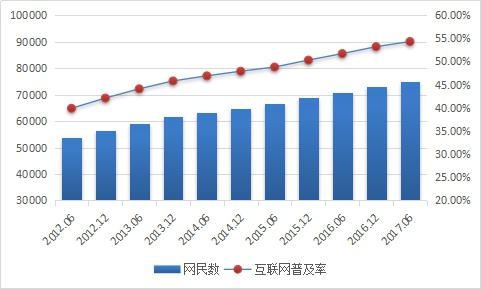 根據(jù)CNNIC最新數(shù)據(jù)顯示,截止2017年6月,我國網(wǎng)民規(guī)模達到7.51億,半年共計新增網(wǎng)民1992萬人?;ヂ?lián)網(wǎng)普及率為54.3%,較2016年底提升1.1個百分點。我國網(wǎng)民規(guī)模增長趨于穩(wěn)定,互聯(lián)網(wǎng)行業(yè)持續(xù)穩(wěn)健發(fā)展,以互聯(lián)網(wǎng)為代表的數(shù)字技術正在加速與經(jīng)濟社會各領域深度融合,成為促進我國消費升級、經(jīng)濟社會轉型、構建國家競爭新優(yōu)勢的重要推動力。