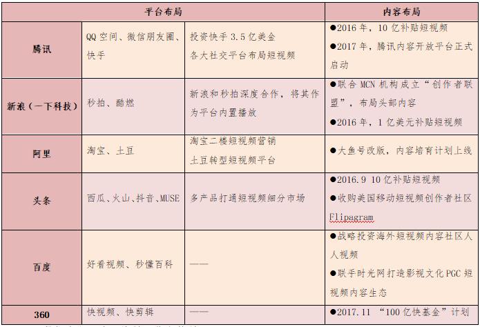 以BAT為首的機構重金加速布局短視頻平臺。今日頭條、騰訊、秒拍等均投入10億元扶持短視頻內(nèi)容創(chuàng)業(yè)者。阿里投入20億元進軍短視頻領域,將土豆網(wǎng)打造為專門的短視頻平臺。騰訊專門成立短視頻中心,負責短視頻平臺運行;愛奇藝短視頻平臺的愛奇藝頭條正在內(nèi)測;秒拍成為新浪微博獨家短視頻應用,從工具型短視頻機構轉型為社交分享類短視頻平臺;華人文化基金領投的資訊類短視頻平臺梨視頻也已形成業(yè)內(nèi)影響力;咪咕視訊作為中國移動在視頻領域的唯一版權運營實體,也布局短視頻,與中央電視臺共建業(yè)內(nèi)領先的短視頻創(chuàng)作者聚集平臺,打造頭部賬號體系,孵化自有明星短視頻賬號,引入知名工作室直接簽約,盤整已有的強IP資源賬號化運作。