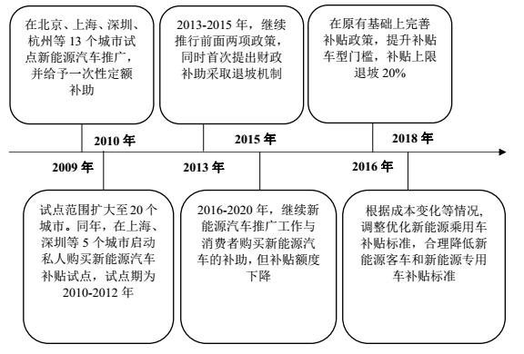 2009年國家開始新能源汽車推廣試點,隨著新能源汽車市場發(fā)展,國家對補貼政策也有所調整。近年來,國家對新能源汽車的補貼政策呈現補貼額度收緊,補貼門檻逐漸提高的趨勢。