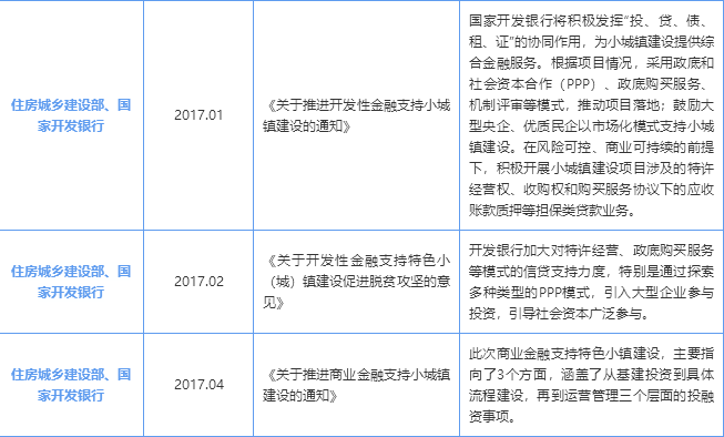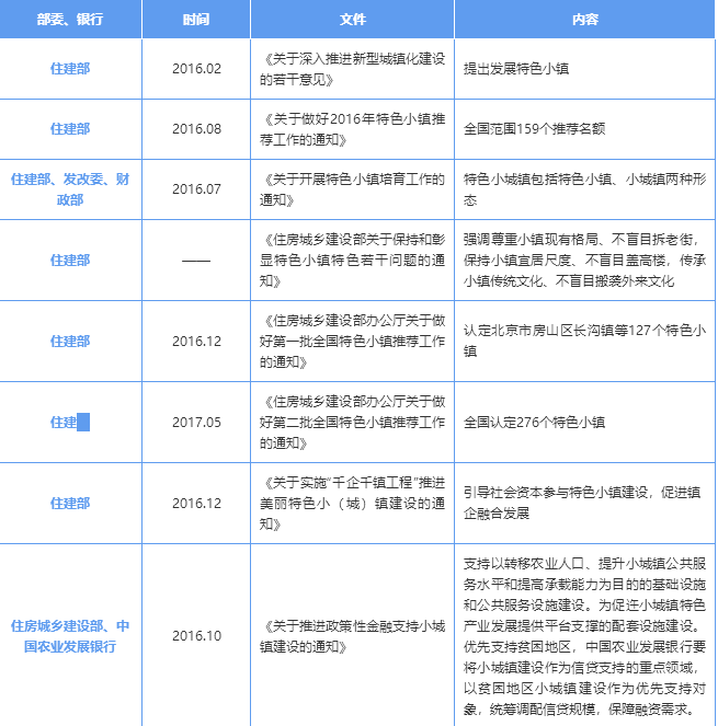 2016年以來,國家發(fā)改委、住建部聯(lián)合多個銀行出臺多項支持特色小鎮(zhèn)建設(shè)的政策文件及金融支持文件。