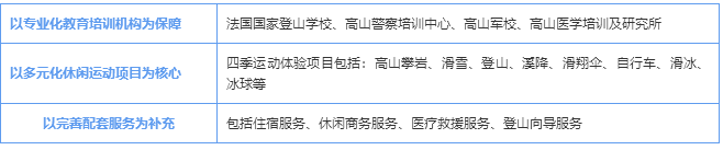 在法國,登山向?qū)︻櫩偷男袨槌袚?dān)法律責(zé)任,這些以技術(shù)高超、經(jīng)驗豐富,責(zé)任感強而著稱的向?qū)冊谌澜缍枷碛惺⒆u。國立登山滑雪學(xué)校開設(shè)的項目有登山向?qū)?、滑雪教練、高山協(xié)作、救援、滑翔傘教練。學(xué)校設(shè)備齊全,配有六個可容納20至80人的會議室、一個可容納220人且配有錄像投影機的階梯教室、一棟配有132個標(biāo)間的宿舍樓、一個自助餐中心、一個健身房、一個器材室及其它科研場所。因為ENSA的存在,沙木尼成為全球登山標(biāo)準(zhǔn)的定制者,完善的培訓(xùn)和卓越的服務(wù)成為其登山產(chǎn)業(yè)發(fā)展的護城河。