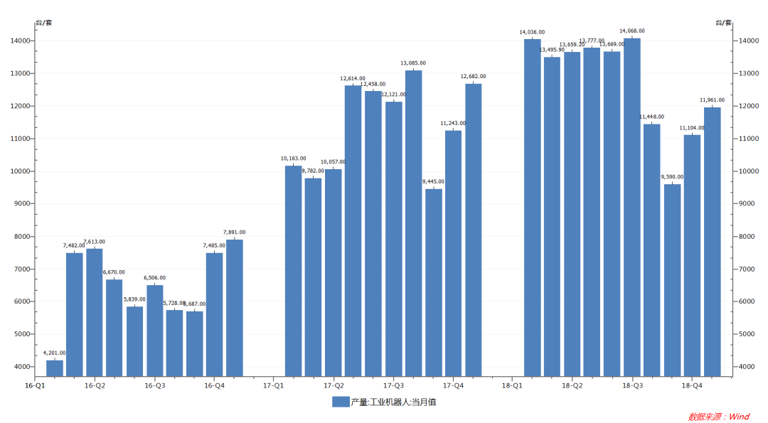 2018年1-12月,我國(guó)工業(yè)機(jī)器人產(chǎn)量達(dá)14.7萬(wàn)臺(tái),同比增長(zhǎng)12.2%;其中12月份產(chǎn)量達(dá)11961臺(tái)。受國(guó)內(nèi)宏觀經(jīng)濟(jì)下行,下游汽車、3C、新能源等行業(yè)投資放緩和中美貿(mào)易戰(zhàn)的影響,國(guó)內(nèi)工業(yè)機(jī)器人行業(yè)發(fā)展壓力逐步顯現(xiàn),6月、7月、8月增幅相比前幾個(gè)月35%的增速大幅下降。但工業(yè)機(jī)器人行業(yè)短期的增速放緩并不能改變機(jī)器代人的大趨勢(shì)。我國(guó)自動(dòng)化改造空間巨大,制造業(yè)轉(zhuǎn)型升級(jí)迫切;人口紅利逐步消失,老齡化問(wèn)題嚴(yán)重,勞動(dòng)力出現(xiàn)短缺;疊加國(guó)家政策的大力支持,我國(guó)工業(yè)機(jī)器人行業(yè)未來(lái)發(fā)展空間仍然巨大。