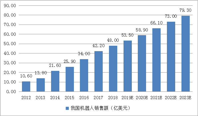 2018年,我國(guó)工業(yè)機(jī)器人銷售額達(dá)48億美元,同比增長(zhǎng)24.1%。未來(lái)隨著生產(chǎn)方式向柔性、智能、精細(xì)轉(zhuǎn)變,對(duì)工業(yè)機(jī)器人的需求將呈現(xiàn)大幅增長(zhǎng)。根據(jù)前瞻產(chǎn)業(yè)研究院的預(yù)測(cè),到2023年,國(guó)內(nèi)市場(chǎng)規(guī)模將翻一番,進(jìn)一步擴(kuò)大到79.3億美元。