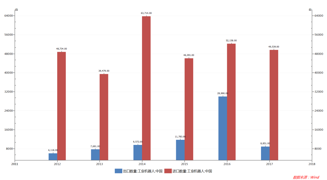 中國(guó)工業(yè)機(jī)器人進(jìn)出口數(shù)量(臺(tái))