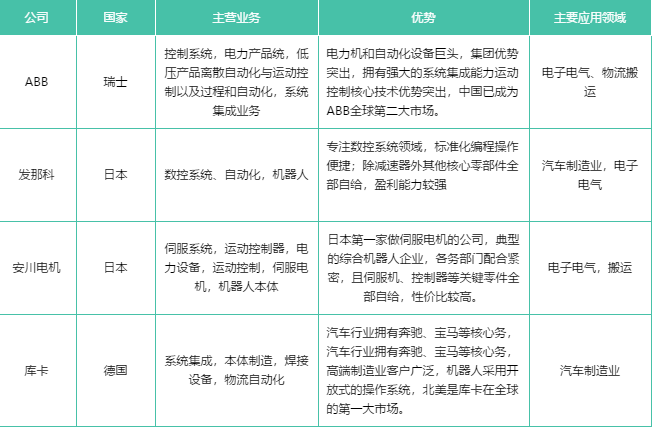 在世界工業(yè)機(jī)器人行業(yè)中,以瑞士的ABB、德國(guó)的庫(kù)卡、日本的發(fā)那科和安川電機(jī)最為著名,并稱為工業(yè)機(jī)器人“四大家族”。它們?cè)趤喼奘袌?chǎng)上同樣有著舉足輕重的地位,在中國(guó)工業(yè)機(jī)器人市場(chǎng)上占據(jù)大半江山,幾乎壟斷了機(jī)器人本體制造、焊接等高端領(lǐng)域。