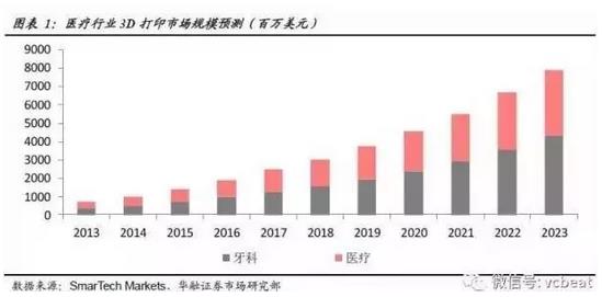 根據(jù)SmarTech《牙科3D打印2015:一個(gè)十年的機(jī)會(huì)預(yù)測(cè)與分析》中的預(yù)測(cè),3D打印技術(shù)在牙科領(lǐng)域的市場(chǎng)規(guī)模到2016年會(huì)達(dá)到20億美元,2020年銷售規(guī)??缮仙?1億美元。
