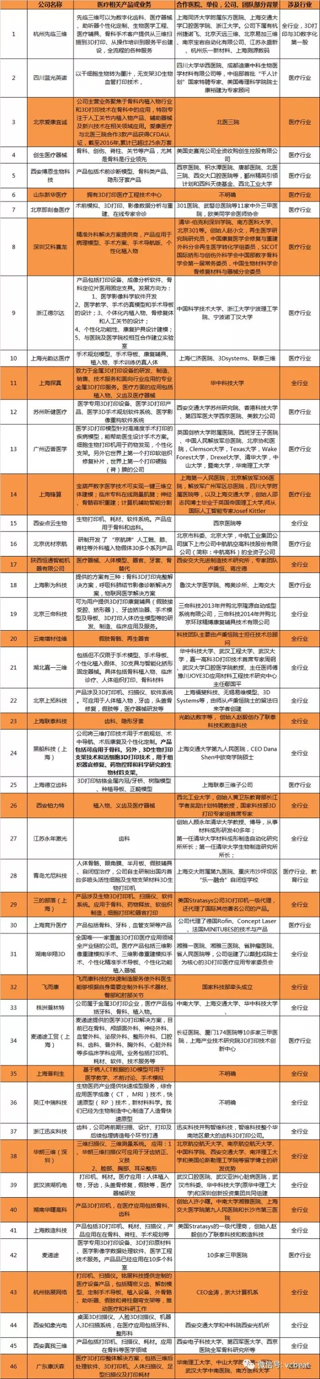 在做這個(gè)選題之前,本以為國(guó)內(nèi)的相關(guān)企業(yè)會(huì)很少,可是此次盤點(diǎn)動(dòng)脈網(wǎng)一共找到46家與3D醫(yī)療打印相關(guān)的企業(yè)(由于時(shí)間和信息量的關(guān)系,相信我們收集的數(shù)據(jù)并不全面,未收錄到的企業(yè)和機(jī)構(gòu)請(qǐng)與我們聯(lián)系)。