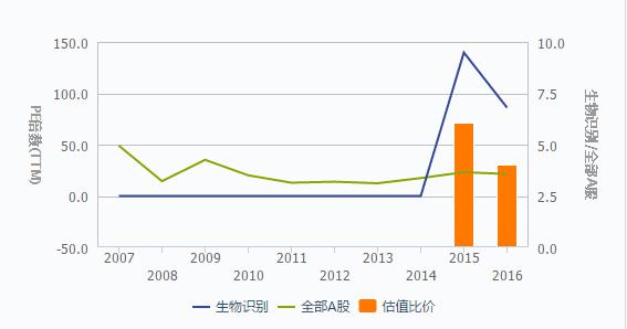 在2014年以前,人臉識(shí)別技術(shù)所屬的生物識(shí)別行業(yè)市盈率PE低于全部A股PE,其值在0附近;2014年至2016年,生物識(shí)別行業(yè)PE高于全部A股均值,并在2015年接近150%,被市場(chǎng)看好。