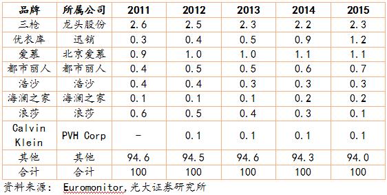 內(nèi)衣作為消費(fèi)者的第二層“肌膚”,消費(fèi)者對內(nèi)衣的消費(fèi)比其他成衣具備更強(qiáng)的忠誠度,進(jìn)入 21 世紀(jì)后,消費(fèi)者對內(nèi)衣品牌的認(rèn)可也越來越強(qiáng)。 雖然部分品牌由于品牌老化導(dǎo)致市占率降低,但是總體看,前 16 家女士內(nèi)衣品牌的市場份額從 2011 年的 13.9%提升到了 2015 年的 15%。前八大男士內(nèi)衣品牌的市占率從 5.4%提升到 6%。