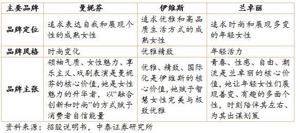 公司實行多品牌運(yùn)作戰(zhàn)略,針對不同年齡段和不同風(fēng)格的消費(fèi)者推出三個中高端核心品牌“曼妮芬”、 “伊維斯”和“蘭卓麗”,三個副牌COYEEE、Bodybeauty 和喬百仕。其中,主打品牌“曼妮芬”連續(xù) 12 年市占率第一,其市占率長期領(lǐng)先于規(guī)模最大的內(nèi)衣公司安莉芳的主品牌“安莉芳”。第二大品牌“伊維斯”連續(xù)兩年市場份額排名前十。