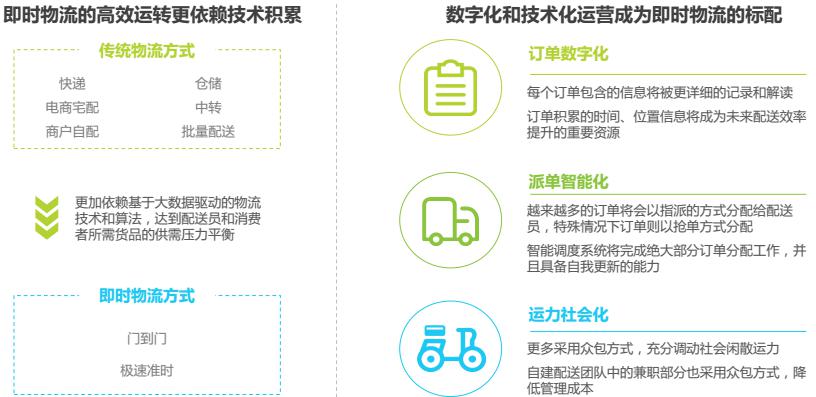 快速、及時(shí)、實(shí)時(shí)的物流實(shí)現(xiàn)路徑是“新零售” 的必備條件,即時(shí)物流在居民生活中扮演著越來越重要的角色,物流能力向下滲透觸及居民生活的方方面面,為衣食住行的全方位互聯(lián)網(wǎng)化提供現(xiàn)實(shí)基礎(chǔ),未來新零售趨勢下的即時(shí)需求比重會逐步增加。