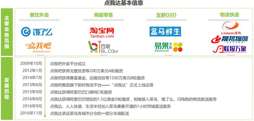 即時(shí)物流平臺點(diǎn)我達(dá)脫胎于外賣平臺點(diǎn)我吧,憑借出色的運(yùn)營和調(diào)度能力快速發(fā)展。2016年7月,獲得阿里領(lǐng)投的1.5億美金D輪融資,并接入菜鳥網(wǎng)絡(luò)城市配送體系,成為阿里物流布局戰(zhàn)略重點(diǎn)。相較于其他即時(shí)物流平臺,點(diǎn)我達(dá)擁有淘系電商龐大的資源背景作為支撐,訂單來源除O2O平臺之外還包括物流、電商等,在競爭中占據(jù)絕對優(yōu)勢。