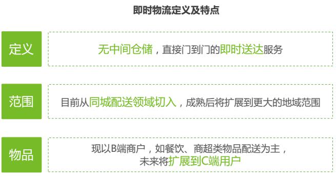 即時(shí)物流在餐飲外賣等行業(yè)有所涉及。2009年,“即時(shí)物流”概念由點(diǎn)我達(dá)創(chuàng)始人趙劍鋒提出。2016年8月,點(diǎn)我達(dá)接受阿里巴巴近10億元投資,“即時(shí)物流”概念廣泛傳播。2016年11月召開的互聯(lián)網(wǎng)大會上,美團(tuán)點(diǎn)評和餓了么相繼強(qiáng)調(diào)“即時(shí)配送”業(yè)務(wù)。區(qū)別于傳統(tǒng)物流方式,即時(shí)物流的核心特點(diǎn)在于即時(shí)性,滿足用戶提出的極速、準(zhǔn)時(shí)的配送要求。目前,即時(shí)物流以同城、小件領(lǐng)域切入,拓展到生鮮、商超配送領(lǐng)域,再逐步擴(kuò)展到更為廣泛的快遞末端領(lǐng)域。