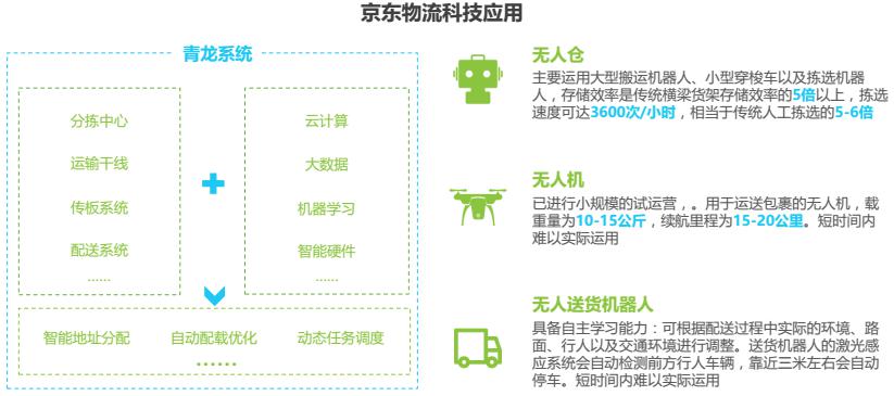 京東于2016年成立了X事業(yè)部,專注智慧物流相關(guān)技術(shù)的研發(fā)。2017年4月京東物流宣布獨(dú)立運(yùn)營,成立物流子公司。截止2017年6月,京東在全國范圍內(nèi)擁有256個(gè)大型倉庫,6906個(gè)配送站和自提點(diǎn),包括已經(jīng)運(yùn)營了7個(gè)大型智能化物流中心“亞洲一號”。目前京東自營配送覆蓋了全國98%的人口,壓縮商品流通成本70%,提升物流運(yùn)營效率2倍以上。京東物流科技的應(yīng)用主要包括兩個(gè)方面,一是基于大數(shù)據(jù)預(yù)測分析技術(shù)實(shí)現(xiàn)智能化的調(diào)度、決策;二是采用一些更自動化、智能化的設(shè)備提升物流效率,最終提升客戶的體驗(yàn)。