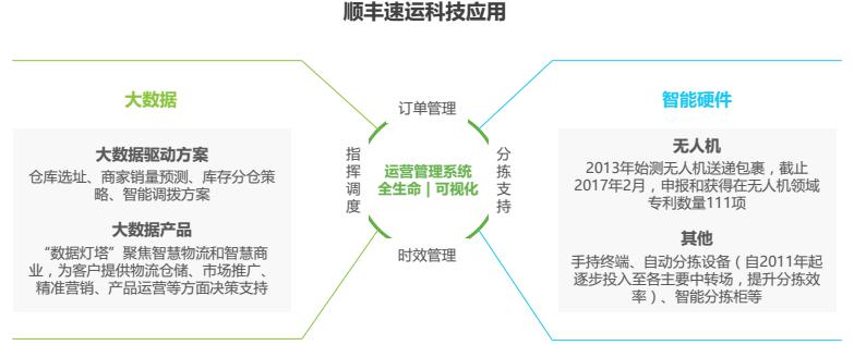 順豐速運(yùn)成立于1993年,截止2016年12月,順豐控股業(yè)務(wù)覆蓋全國331個(gè)地級市、2620個(gè)縣區(qū)級城市,近13000個(gè)自營網(wǎng)點(diǎn)。順豐速運(yùn)業(yè)務(wù)包括國際業(yè)務(wù)、同城配送、冷運(yùn)、重貨(陸路&航運(yùn))等。順豐一貫重視在信息化領(lǐng)域的投入,負(fù)責(zé)集團(tuán)信息系統(tǒng)研發(fā)與運(yùn)維的科技人員超過2,000名,16年信息技術(shù)費(fèi)投入2.6億、占營業(yè)成本0.57%,相較15年提升0.08個(gè)百分點(diǎn)。14-16年來,順豐控股申報(bào)和獲得的專利523項(xiàng),軟件著作權(quán)200多項(xiàng)。未來,順豐還將繼續(xù)擴(kuò)大在科技領(lǐng)域投入,不斷提高各方面的科技與智能化水平。