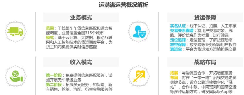 運(yùn)滿滿成立于2013年,是基于云計(jì)算、大數(shù)據(jù)、移動互聯(lián)網(wǎng)和人工智能技術(shù)開發(fā)的貨運(yùn)調(diào)度平臺,為貨主和司機(jī)提供實(shí)時(shí)信息匹配,減少貨運(yùn)空載率、提高物流運(yùn)行效率。由于模式相近,運(yùn)滿滿被業(yè)界稱為“貨運(yùn)版的滴滴”,成立3年來共獲得7輪融資,目前估值超過10億美金。截止2017年9月底,平臺實(shí)名注冊重卡司機(jī)400余萬、貨主100余萬,業(yè)務(wù)覆蓋全國 315 個(gè)城市。運(yùn)滿滿最新推出擔(dān)保交易產(chǎn)品“滿運(yùn)寶”,為貨運(yùn)雙方提供運(yùn)費(fèi)擔(dān)保。此外,運(yùn)滿滿還與阿里云、菜鳥、螞蟻金服、平安保險(xiǎn)、中國聯(lián)通、中國重汽等開展深度戰(zhàn)略合作,通過跨界融合,不斷推出創(chuàng)新產(chǎn)品和服務(wù)。未來,運(yùn)滿滿將借助人工智能、無人駕駛、區(qū)塊鏈等技術(shù)驅(qū)動,提供貫穿全產(chǎn)業(yè)鏈的線上線下服務(wù),構(gòu)建公路物流生態(tài)圈,打造綜合性的貨運(yùn)平臺。