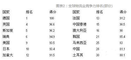 國家的物流業(yè)總體競爭力不僅取決于基礎(chǔ)設(shè)施建設(shè)水平,還取決于整個(gè)物流產(chǎn)業(yè)的管理水平、第三方物流企業(yè)發(fā)展水平和第四方物流企業(yè)的整合能力。從國家層面來看,世界銀行發(fā)布的報(bào)告顯示,在全球物流業(yè)競爭力排行榜(Logistics Performance Index)中,歐洲國家表現(xiàn)最為突出,前20名中超過60%的企業(yè)來自歐洲,亞洲物流業(yè)競爭力最強(qiáng)的國家/地區(qū)是日本(排名第十),其次為中國香港和臺灣地區(qū),中國大陸在全球僅排名第28。總體而言,發(fā)展中國家在基礎(chǔ)設(shè)施、國際運(yùn)輸、物流能力、交貨及時(shí)性等方面還與歐美等發(fā)達(dá)國家存在較大的差距,物流業(yè)的全球競爭能力還十分有限。