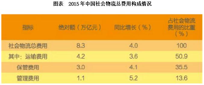 2014年社會物流總費(fèi)用10.6萬億元,同比增長6.9%。社會物流總費(fèi)用與GDP的比率為16.6%,比上年下降0.3個(gè)百分點(diǎn)。其中,運(yùn)輸費(fèi)用5.6萬億元,同比增長6.6%,占社會物流總費(fèi)用的比重為52.9%;保管費(fèi)用3.7萬億元,同比增長7.0%,占社會物流總費(fèi)用的比重為34.9%;管理費(fèi)用1.3萬億元,同比增長7.9%,占社會物流總費(fèi)用的比重為12.2%。