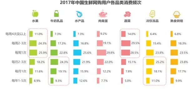 3、生鮮網(wǎng)購仍以水果為主品類,高頻剛需引流作用明顯。