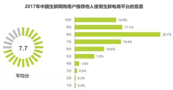 生鮮網(wǎng)購用戶推薦他人使用的意愿較強(qiáng),30.7%的用戶推薦他人使用的意愿為8分。