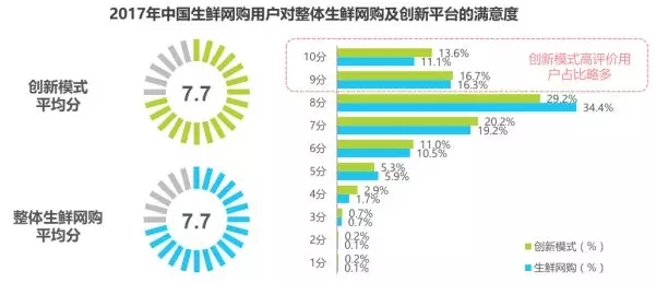 用戶對創(chuàng)新模式整體較為滿意,滿意度與整體生鮮網(wǎng)購基本持平,高評價用戶占比略多。