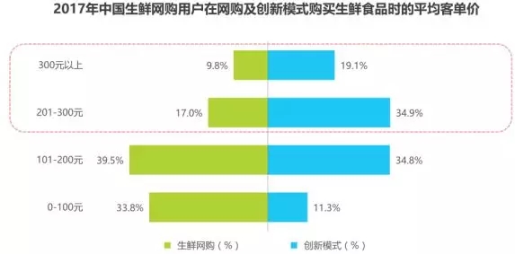 從消費(fèi)金額來看,用戶在創(chuàng)新模式消費(fèi)的單均價明顯高于生鮮網(wǎng)購整體,超過50%的用戶在創(chuàng)新模式消費(fèi)的單均價超過200元。其中,19.1%的用戶在創(chuàng)新模式消費(fèi)單均價超300元,而這一比例在整體生鮮網(wǎng)購平臺僅9.8%。34.9%的用戶在創(chuàng)新模式的客單價在201-300元之間,僅有17.0%的整體生鮮網(wǎng)購用戶客單價在這一區(qū)間。