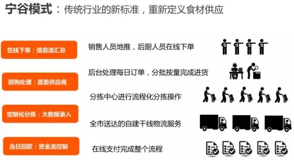 寧谷物配以“易訂貨”軟件為依托,欲打造區(qū)內(nèi)最大的城市商用食材供應(yīng)鏈平臺;其商業(yè)模式是用平臺化團(tuán)購方式+城市內(nèi)自建物流配送體系,實(shí)現(xiàn)對城市餐飲商戶所需食材的全方位供應(yīng)。其生鮮B2B模式在銀川城區(qū)已初具規(guī)模,具有代表性,本報告將著重分析。