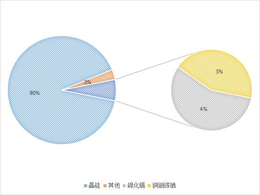 晶硅太陽(yáng)能電池約占市場(chǎng)份額90%;薄膜太陽(yáng)能電池占市場(chǎng)份額約10%,其中碲化鎘市場(chǎng)份額約4%,銅銦鎵硒約占市場(chǎng)份額3%。其他薄膜電池如軍工領(lǐng)域應(yīng)用較多的砷化鎵、目前無法規(guī)?;拟}鈦礦等太陽(yáng)能電池占市場(chǎng)份額約3%。碲化鎘目前90%的市場(chǎng)由美國(guó)薄膜電池制造商First Solar壟斷。